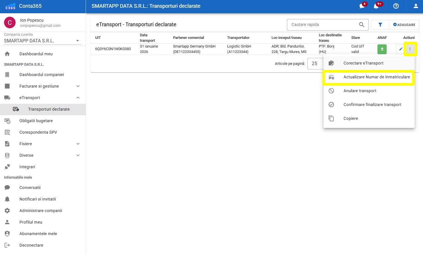 Apasă pe butonul cu cele 3 puncte (⋮) în dreptul transportului, după care apasă pe butonul de Actualizare număr de înmatriculare