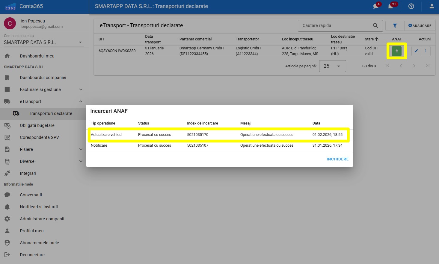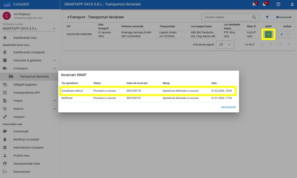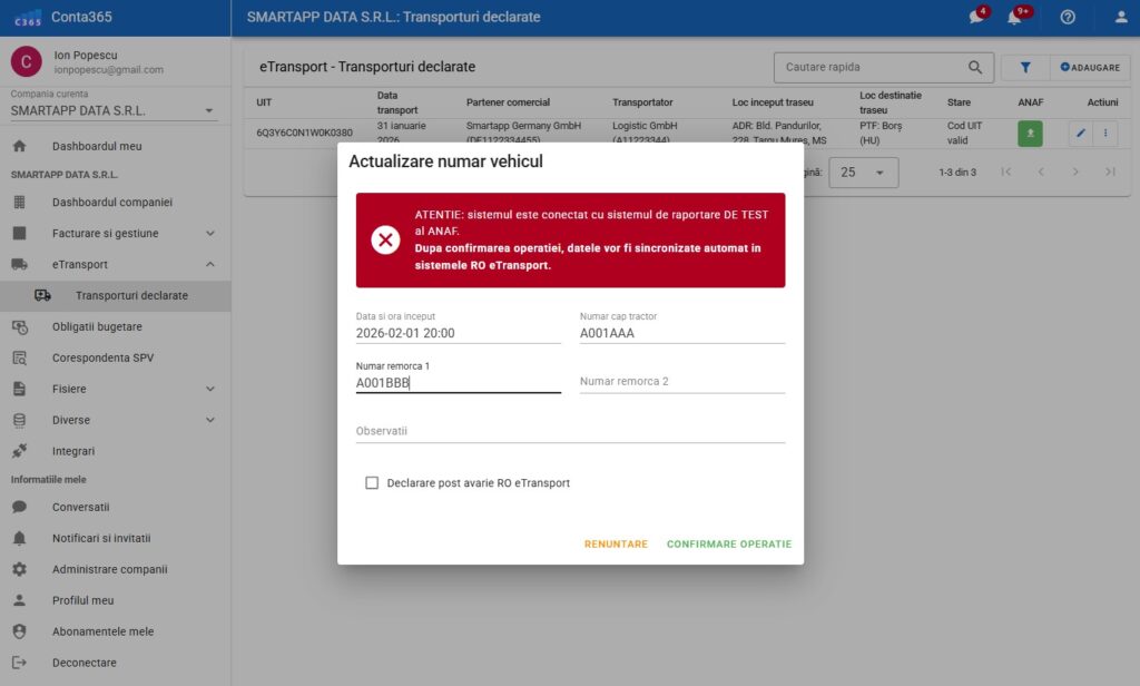 🚛 Actualizare Număr Vehicul (e-Transport în tranzit)
