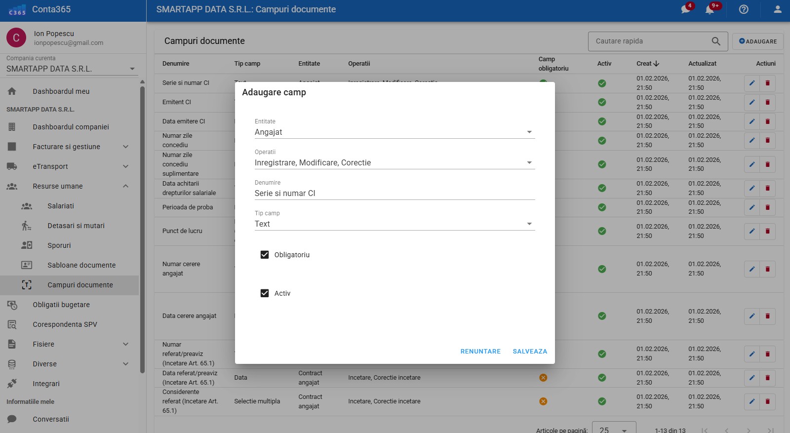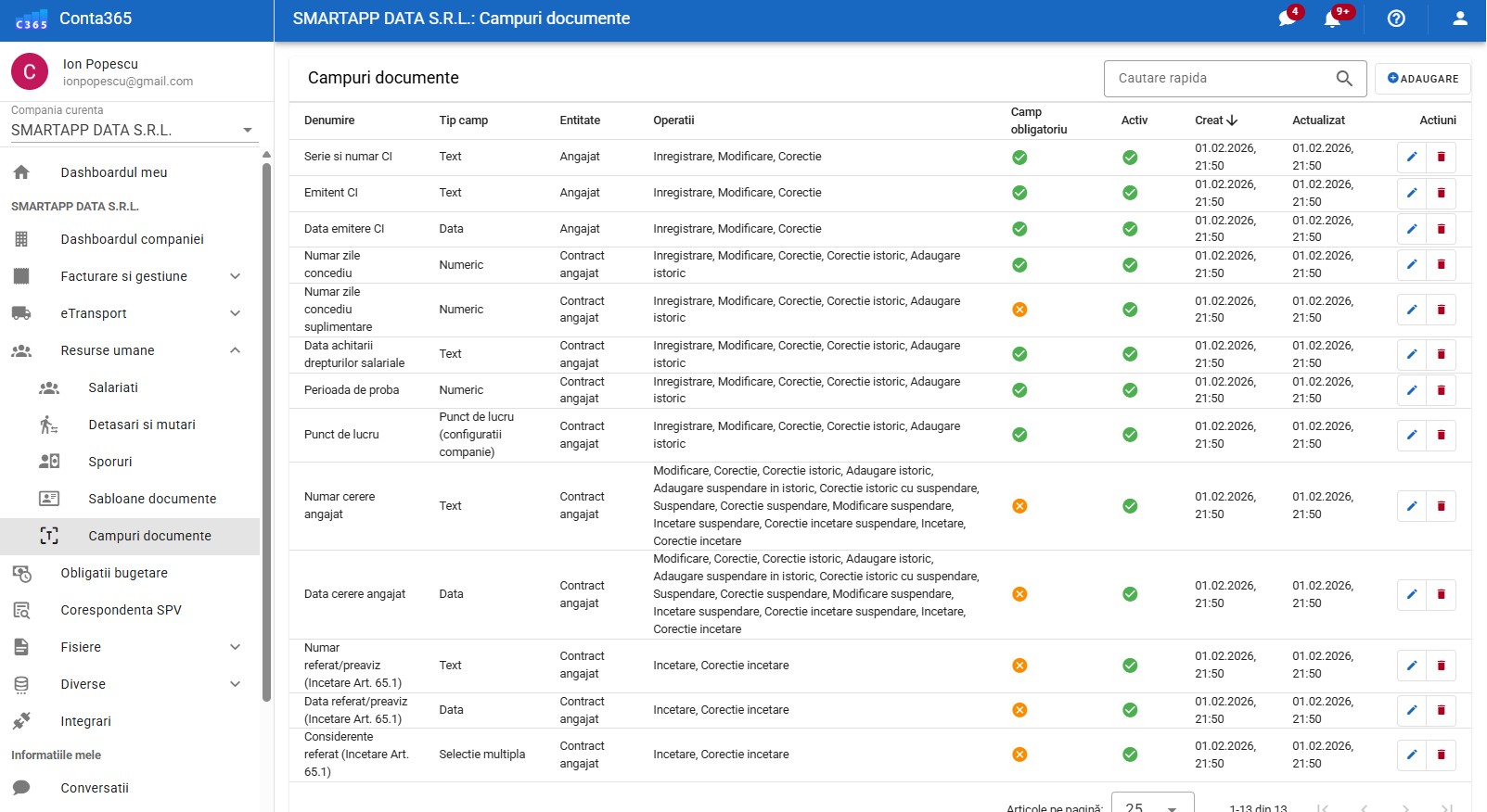 În timp ce REGES impune un set minim de date obligatorii, legislația muncii și nevoile interne ale unei firme necesită colectarea unor informații mult mai detaliate. Secțiunea Câmpuri documente îți permite să extinzi baza de date Conta365 pentru a colecta date precum: Serie/Număr CI, Emitent, Zile concediu sau Data plății salariului.