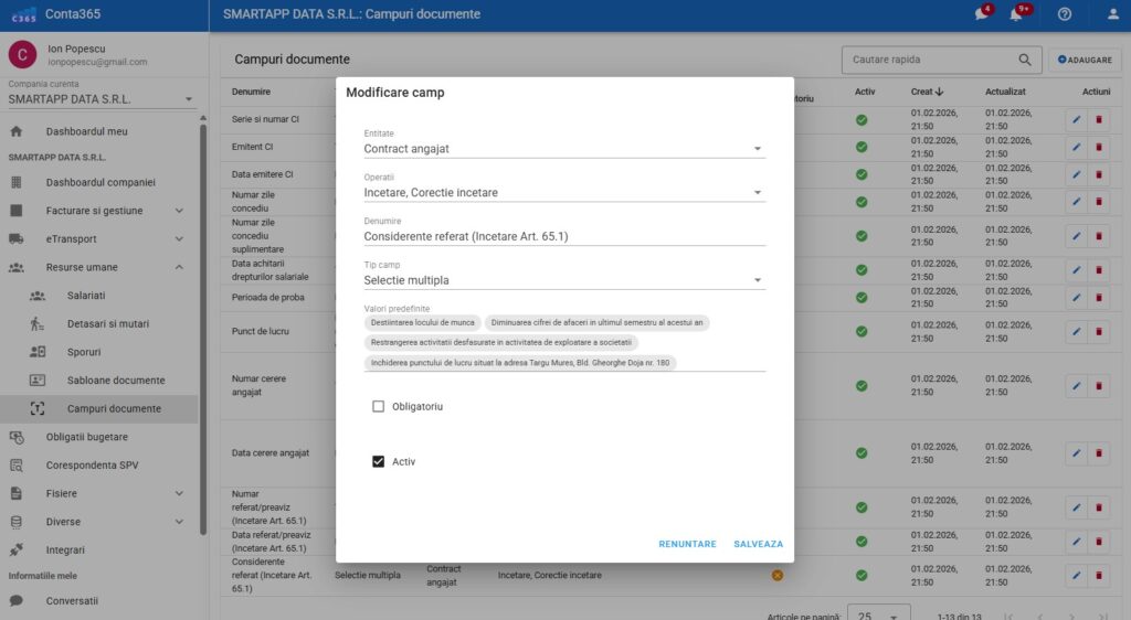💡 Sfat de aur: Atunci când creezi câmpuri pentru contracte, asociază-le cu operațiunea REGES corespunzătoare. Astfel, formularul de adăugare va rămâne curat, afișând doar informațiile relevante pentru acel moment (ex: motivele încetării apar doar la „Încetare contract”).