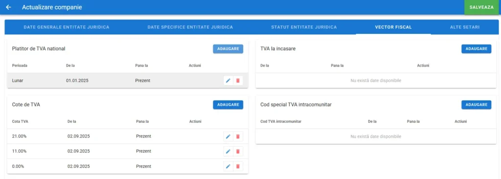 👉 Cotele de TVA enumerate mai sus sunt adăugate automat când îți creezi o firmă nouă.