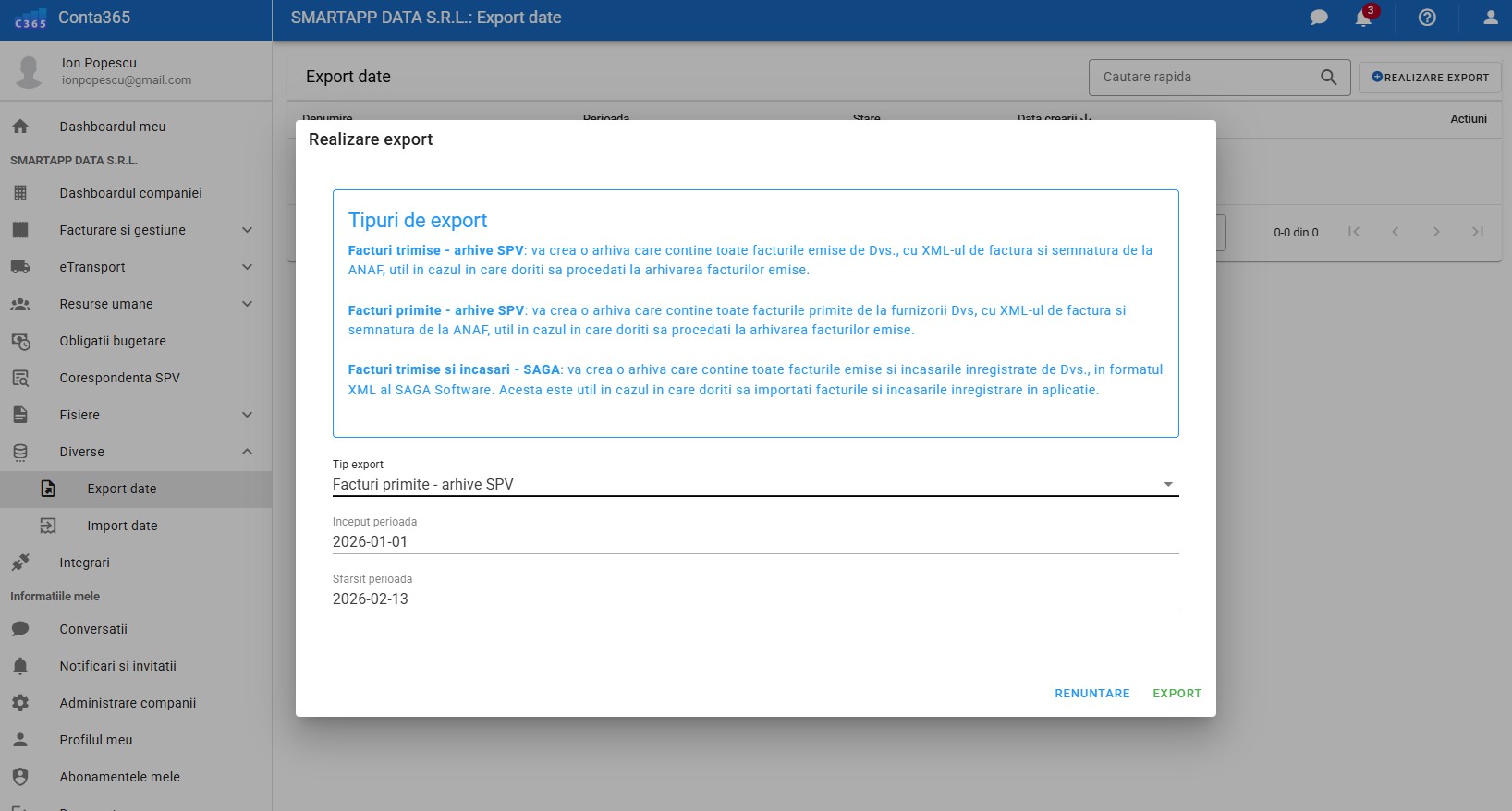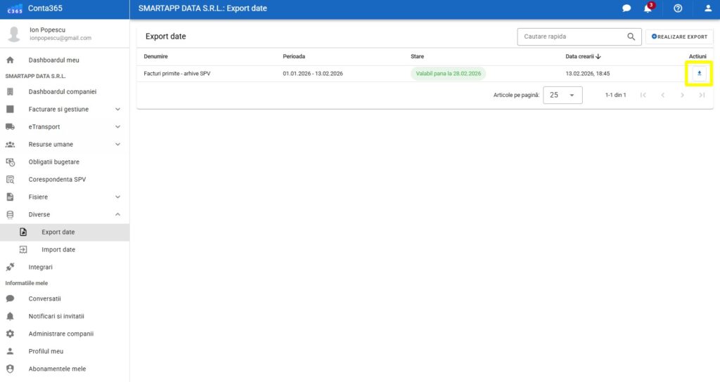 Modulul de Export Date îți permite să descarci rapid volume mari de informații din platformă, fie sub formă de documente PDF oficiale (cu sigiliul ANAF), fie sub formă de fișiere de import pentru software-uri de contabilitate.