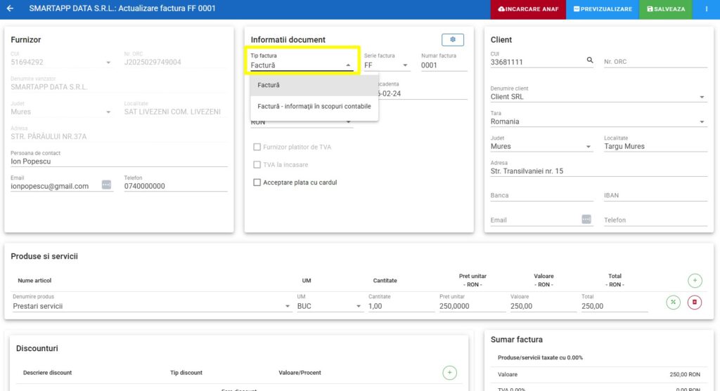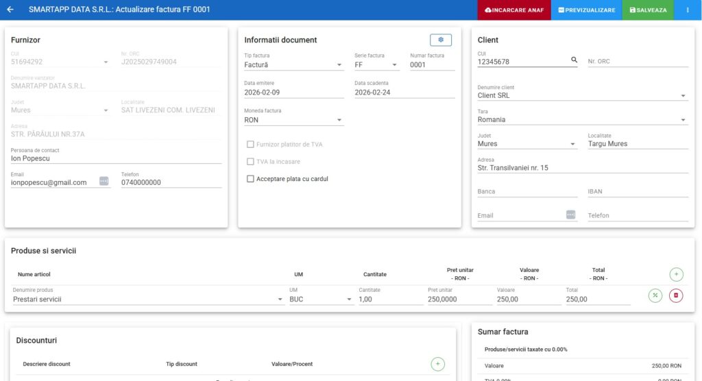 Discounturi: Poți aplica discount comercial sau financiar, procentual sau valoric, atât per linie, cât și la subtotal.