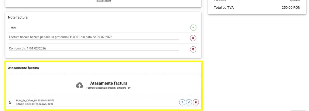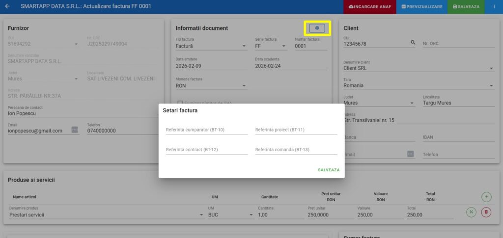 Data emiterii și scadenței: Data emiterii este setată pe “Astăzi”, iar data scadenței este calculată automat conform configurărilor seriei alese. Ambele pot fi modificate manual. Tutorialul de Serii pentru facturi și facturi proforme