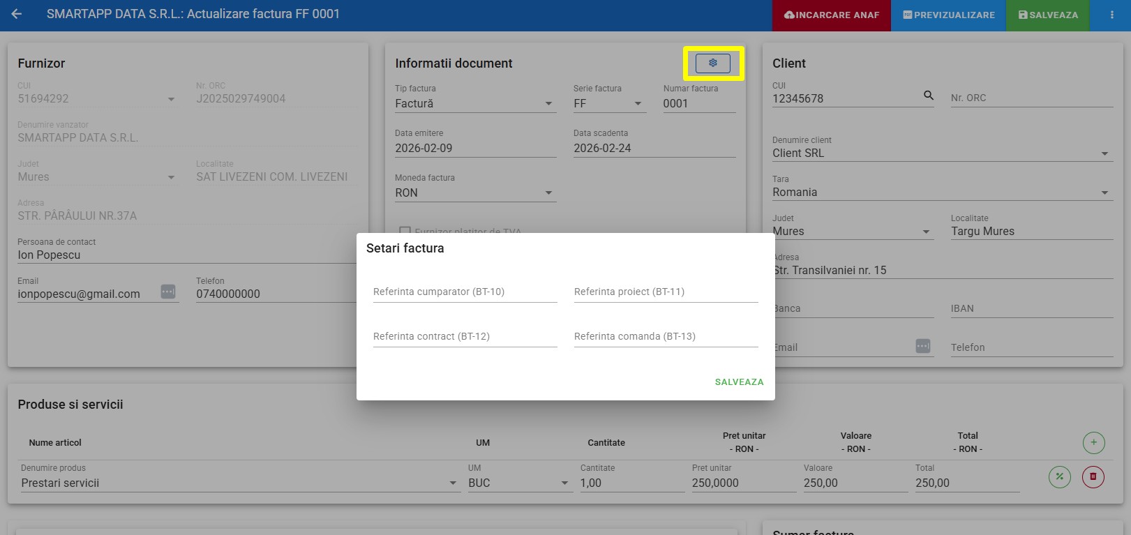 Pentru partenerii care solicită detalii specifice de trasabilitate, apasă pe pictograma Rotită (Settings) din secțiunea Informații document: