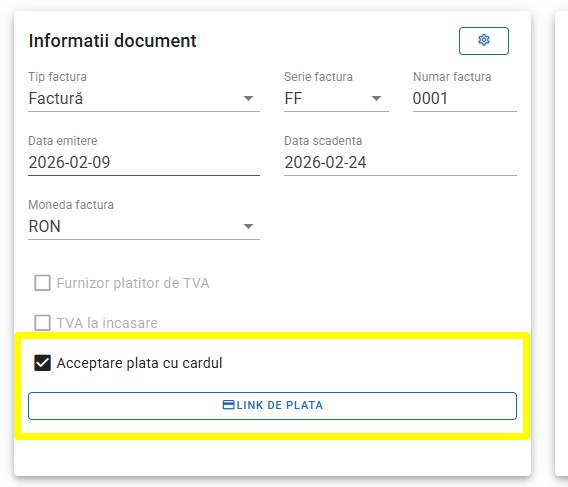 Bifa “Acceptare plată cu cardul”: Activează posibilitatea ca clientul să achite factura online prin Netopia sau Revolut.