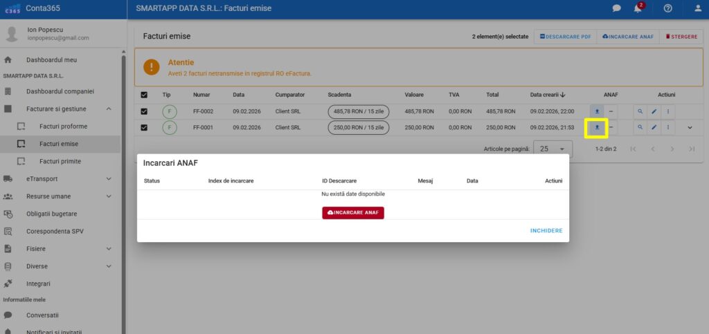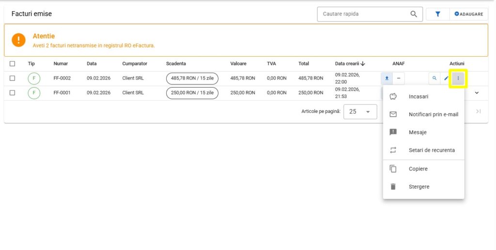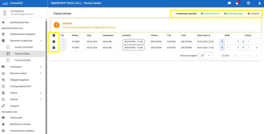 În meniul Facturare și Gestiune -> Facturi emise, ai o privire de ansamblu asupra întregului portofoliu. Aici poți gestiona documentele în masă și poți monitoriza relația cu ANAF.