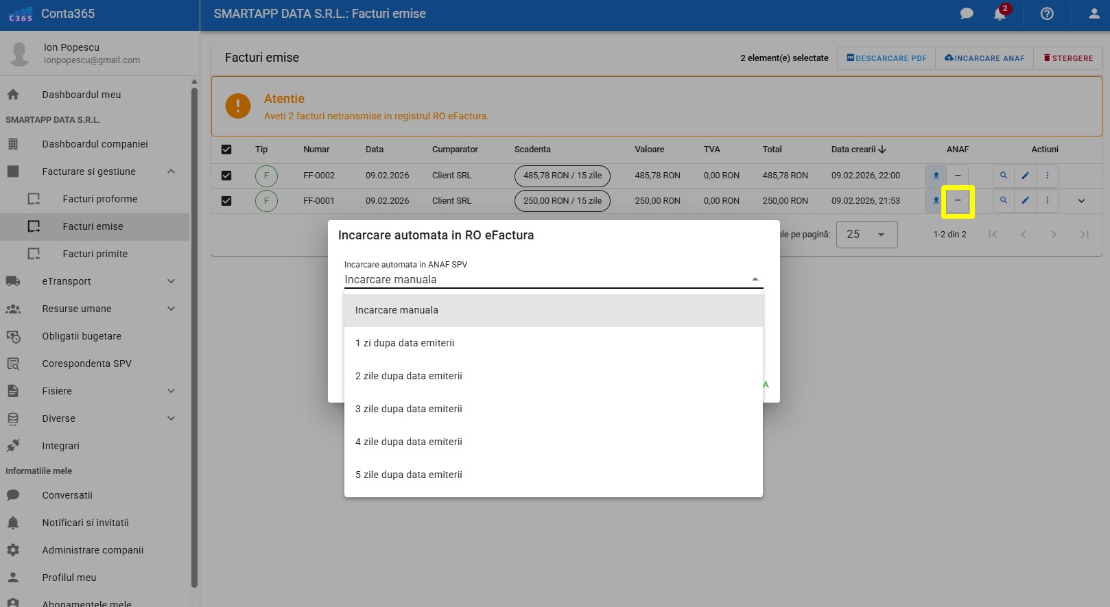 Încărcare Automată: Poți seta sistemul să trimită facturile automat după un interval de 1, 2, 3, 4 sau 5 zile de la data emiterii.