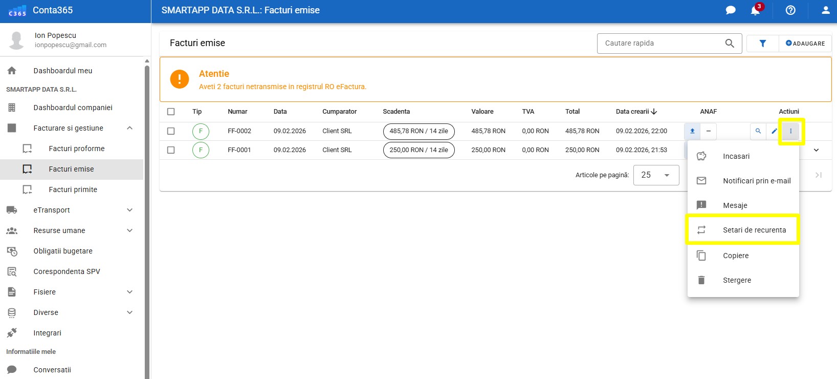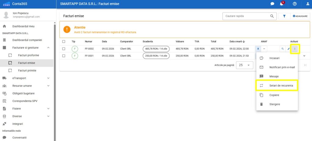 Sfat: Verifică periodic lista facturilor recurente pentru a te asigura că prețurile sau serviciile tale sunt actualizate conform contractelor în vigoare.