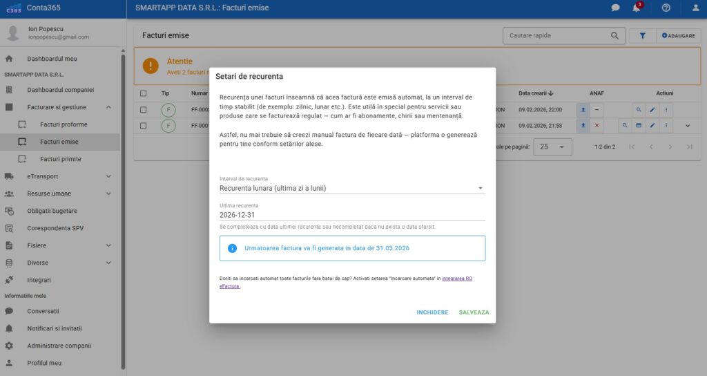 • + Notificări automate: De fiecare dată când sistemul generează o factură nouă prin recurență, vei primi o notificare în aplicație și un email de confirmare care conține lista facturilor generate.