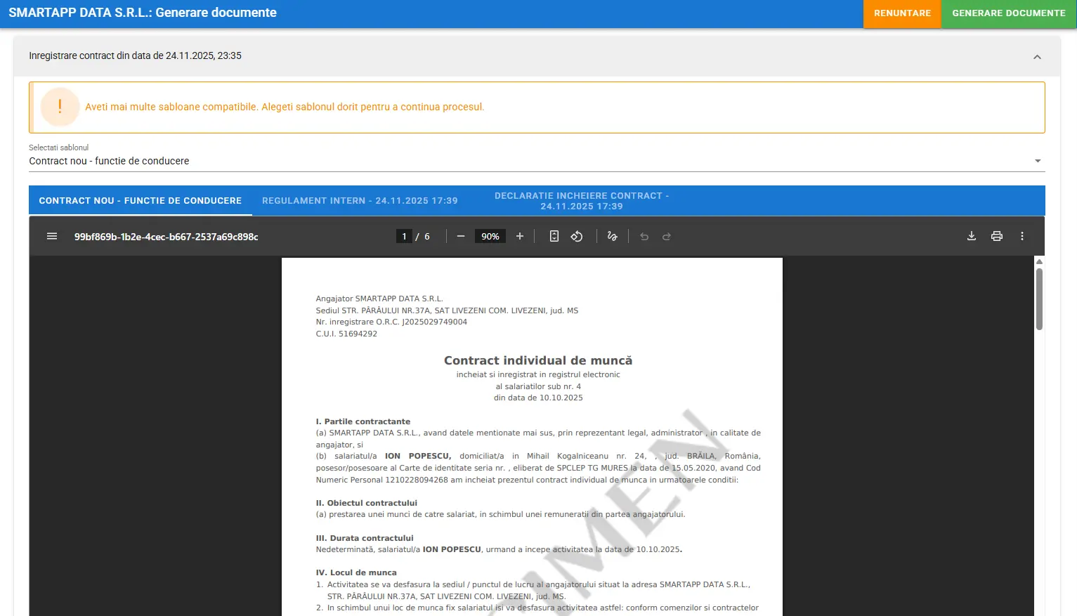În Conta365, generarea documentelor nu mai este o sarcină manuală consumatoare de timp. Sistemul transformă datele introduse în contracte, decizii și acte adiționale gata de semnat, eliminând erorile de redactare și asigurând un aspect profesional uniform.