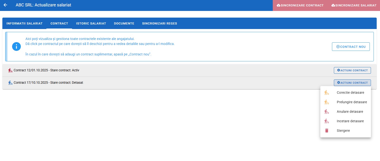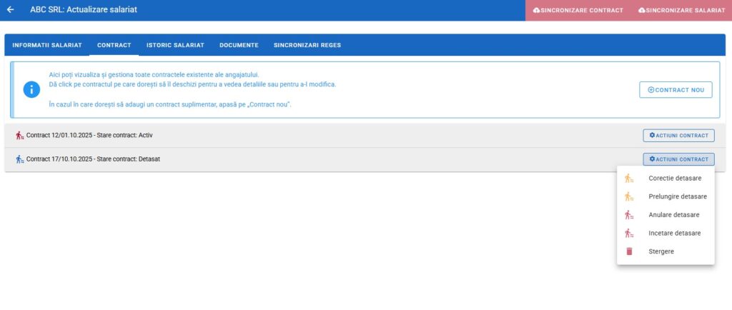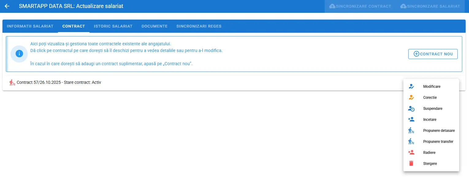 Contracte: Contract nou, Încetare, Reactivare, Anulare încetare.