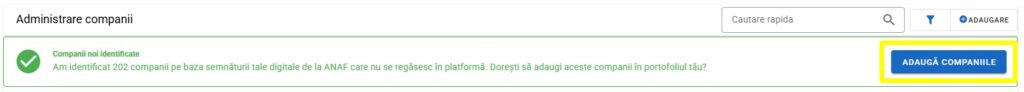 În partea superioară a ecranului, sistemul va afișa o notificare cu numărul de entități pentru care s-a găsit o conexiune validă între semnătura dumneavoastră și baza de date ANAF.