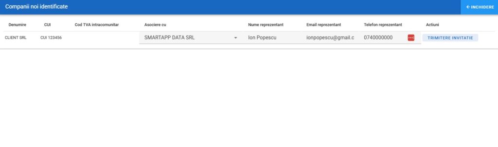 Completare date: Introduceți pentru fiecare client numele reprezentantului, adresa de e-mail și telefonul.