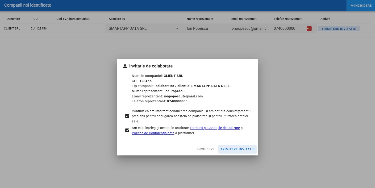 ⚠️ Atenție: Procedura trimite notificări clienților, însă crearea efectivă a contului și acceptul de colaborare rămân în sarcina și la latitudinea acestora.