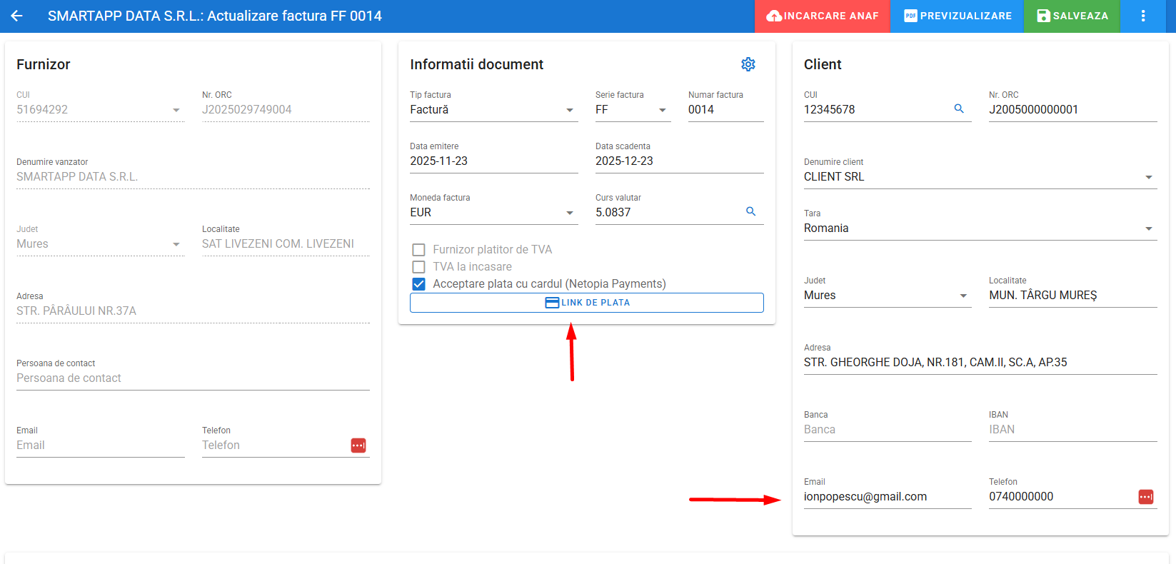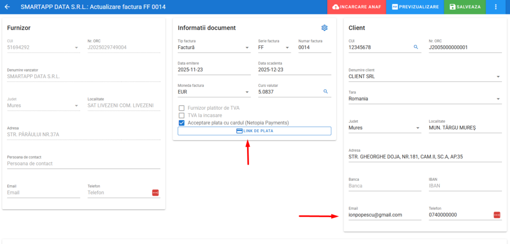 - Se recomandă completarea câmpului Email si Telefon cumpărător fiindcă aceste date sunt folosite de Netopia Payments pentru a trimite email-ul cu confirmarea plății