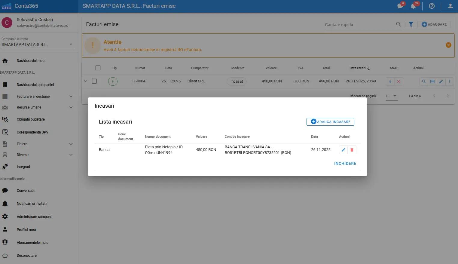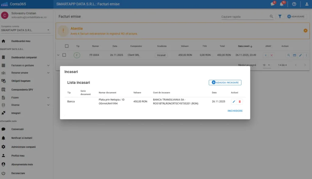 Prin integrarea Netopia Payments în Conta365, transformi facturile tale într-un instrument real de încasare, eliminând transferurile manuale, întârzierile și verificările inutile.