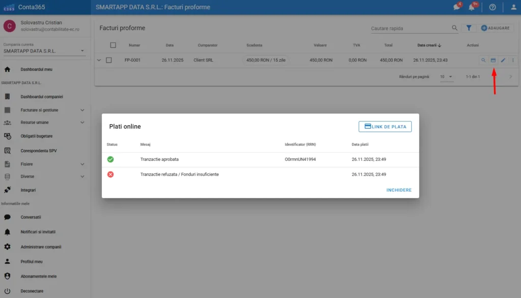 După activarea integrării cu Netopia Payments, în interfața de listă facturi vei observa o pictogramă nouă de card bancar 💳.