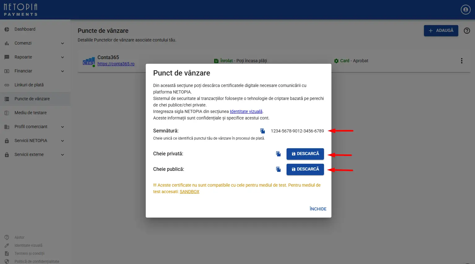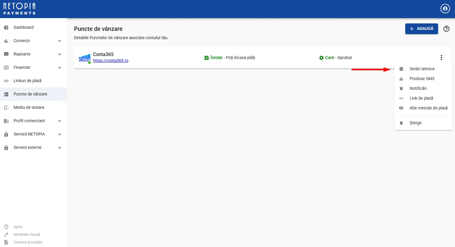 ➡️ Un punct de vânzare aprobat permite platformei Conta365 să trimită comunice cu Netopia Payments și să primească confirmări automate când s-a efectuat o plată.