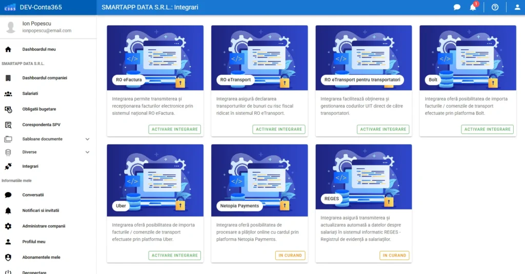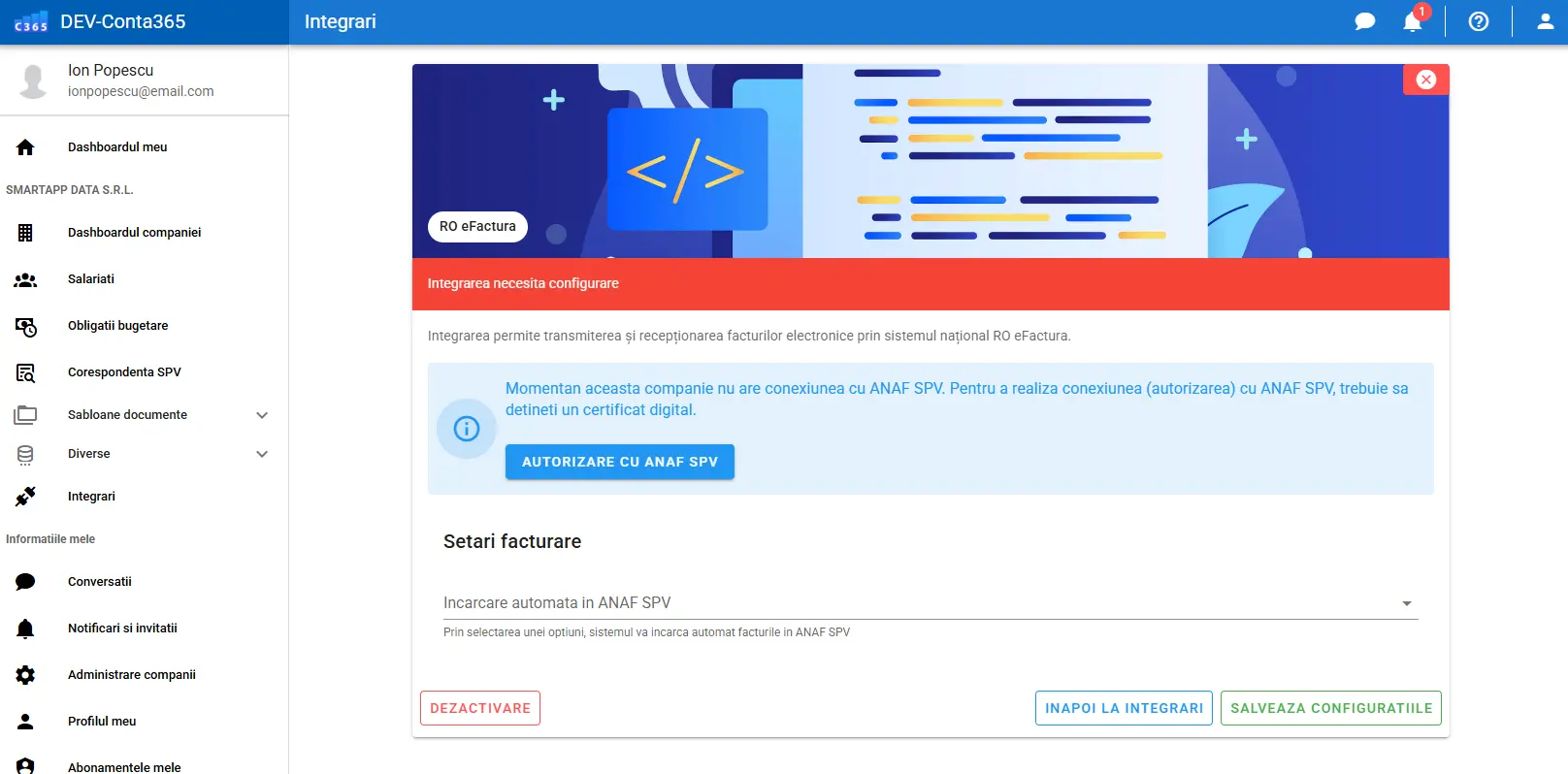 Identifică modulul RO e-Factura și apasă pe butonul Activare după care Configurare integrare.