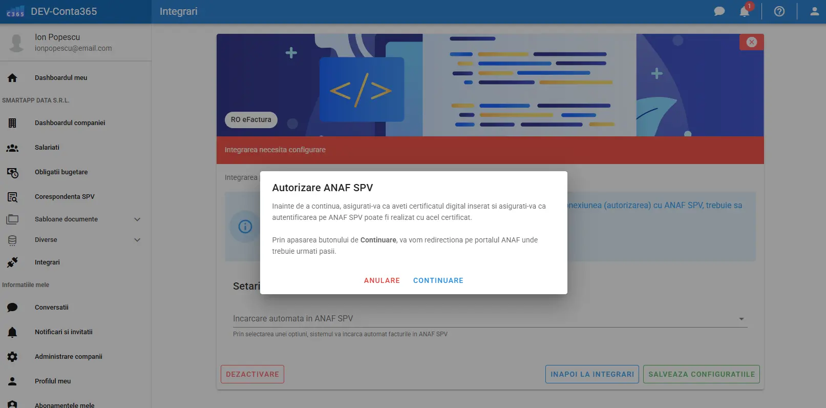 Pentru a putea comunica automat cu sistemul național și pentru a descărca facturile furnizorilor, prima etapă obligatorie este autorizarea accesului prin SPV (Spațiul Privat Virtual ANAF).