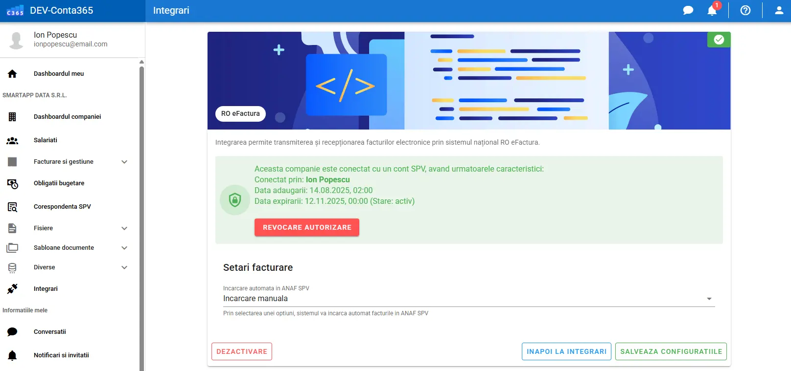 🔄 Reînnoire automată: Nu trebuie să îți faci griji pentru expirare. Conta365 va încerca reînnoirea automată a autorizării înainte de data limită, astfel încât fluxul tău de facturi să rămână neîntrerupt.