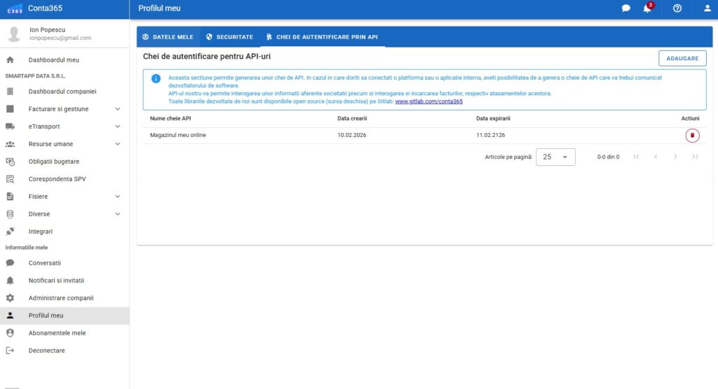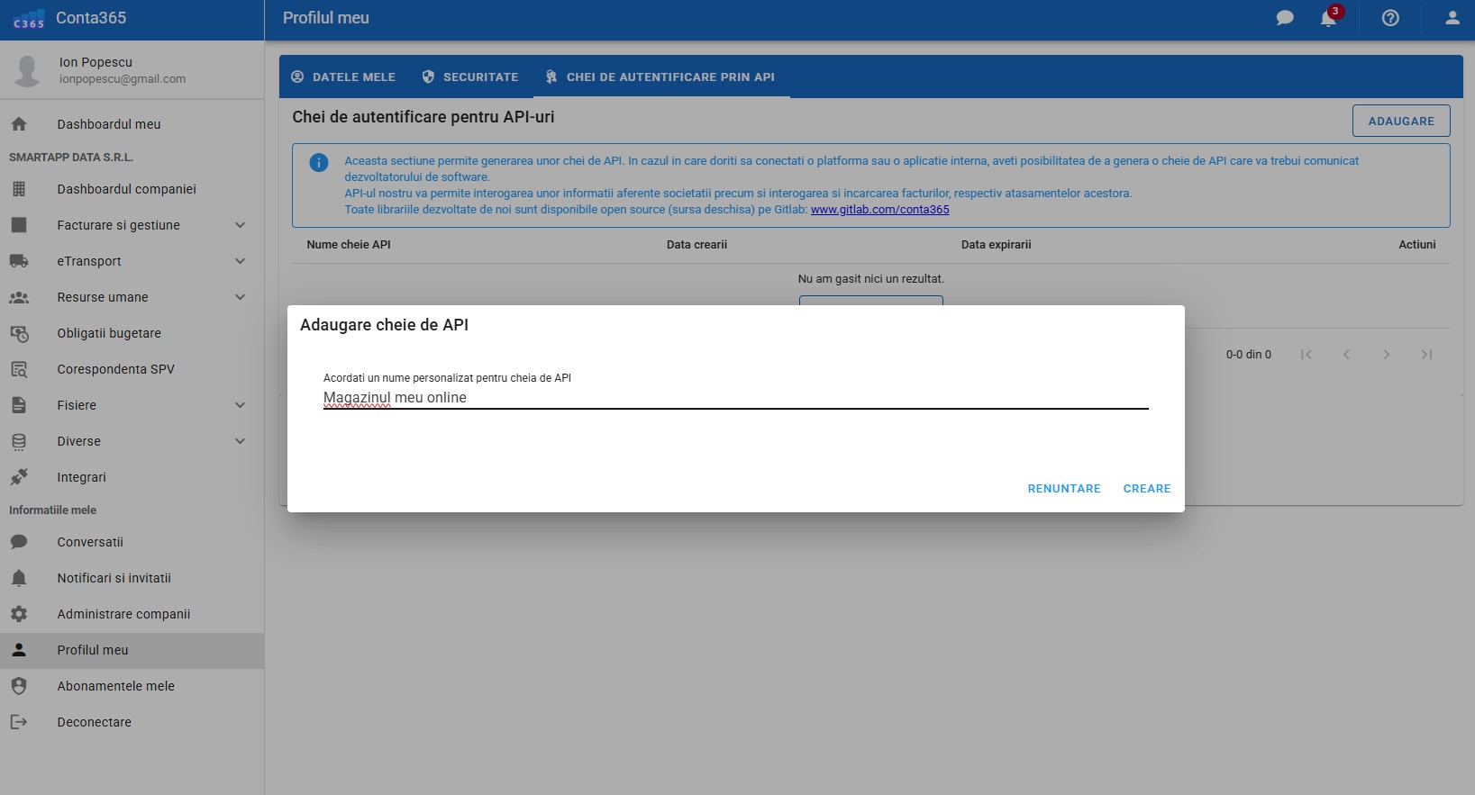Unde găsești cheile: Accesează Profilul meu (clic pe avatar în dreapta sus) -> Chei de autentificare prin API.