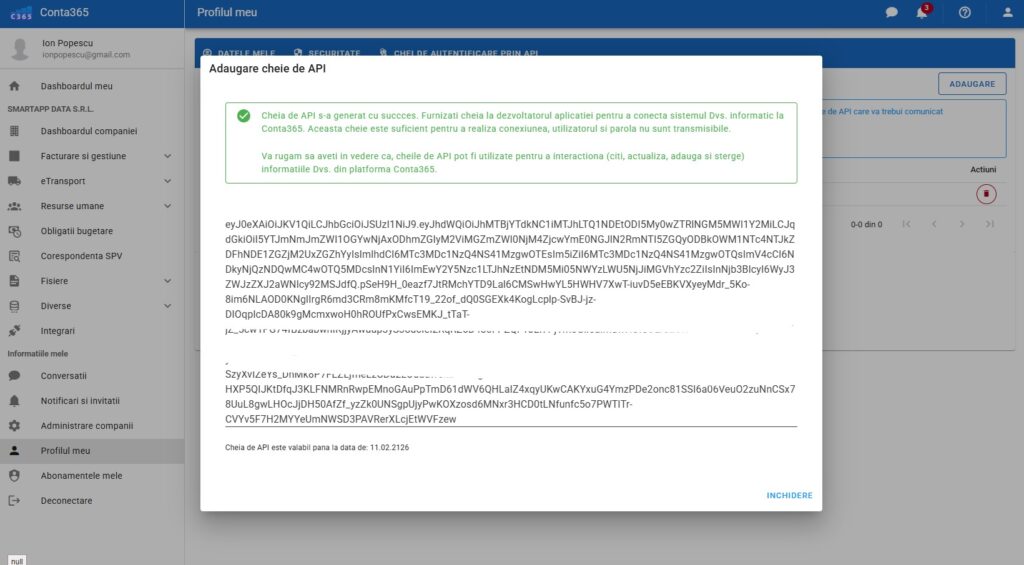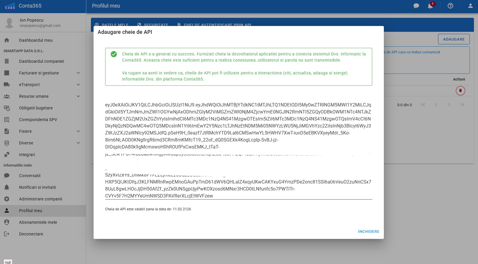 Pentru a începe integrarea, ai nevoie de o cheie de securitate care să permită aplicațiilor externe să comunice cu contul tău Conta365.
