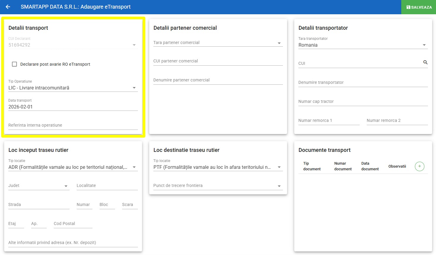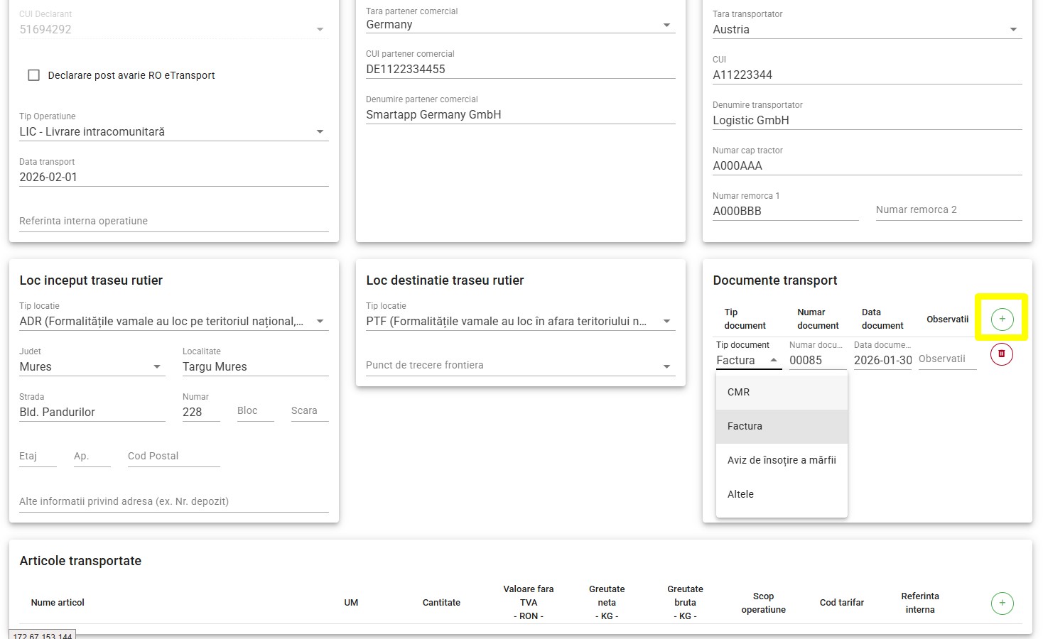 Specificați Tipul, Numărul și Data documentului. Puteți adăuga și Observații dacă există mențiuni speciale pe documentul de transport.