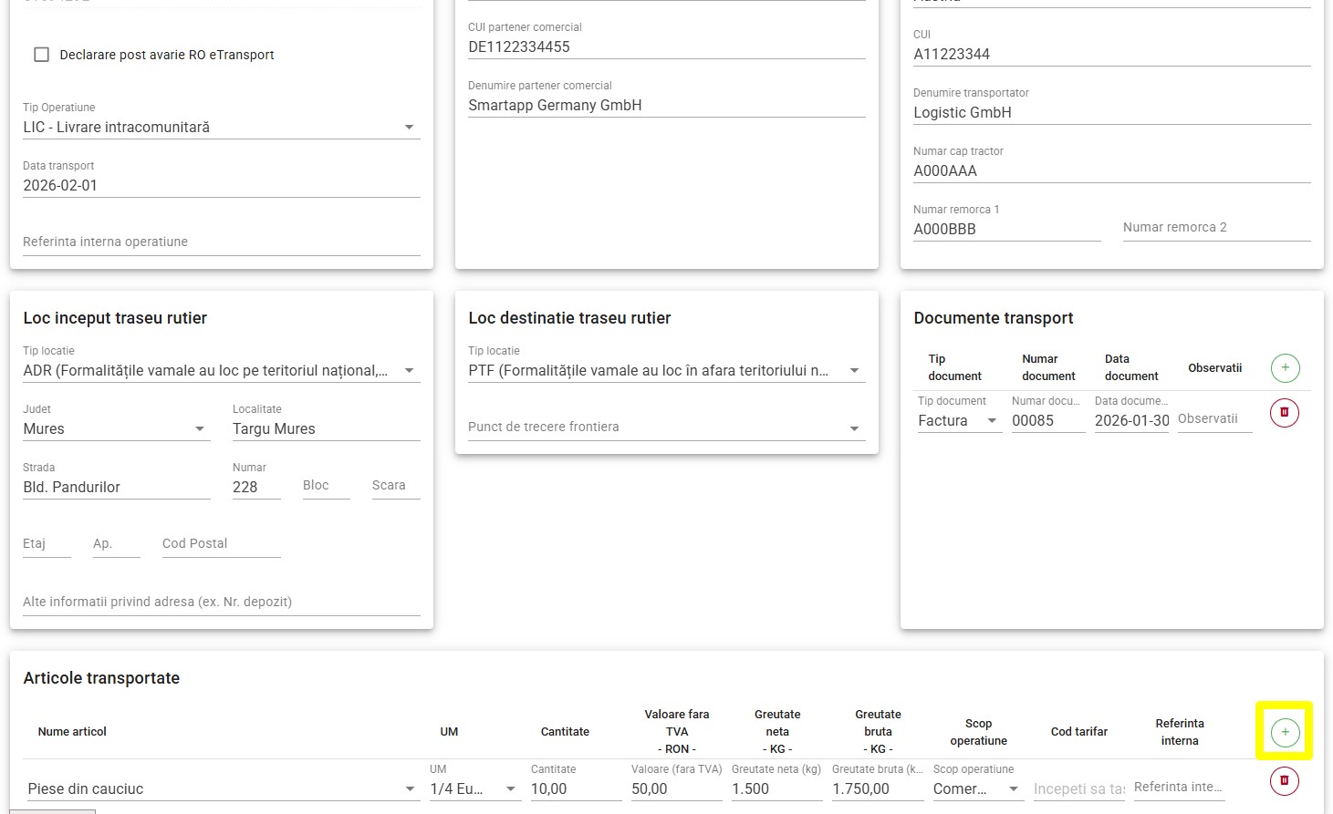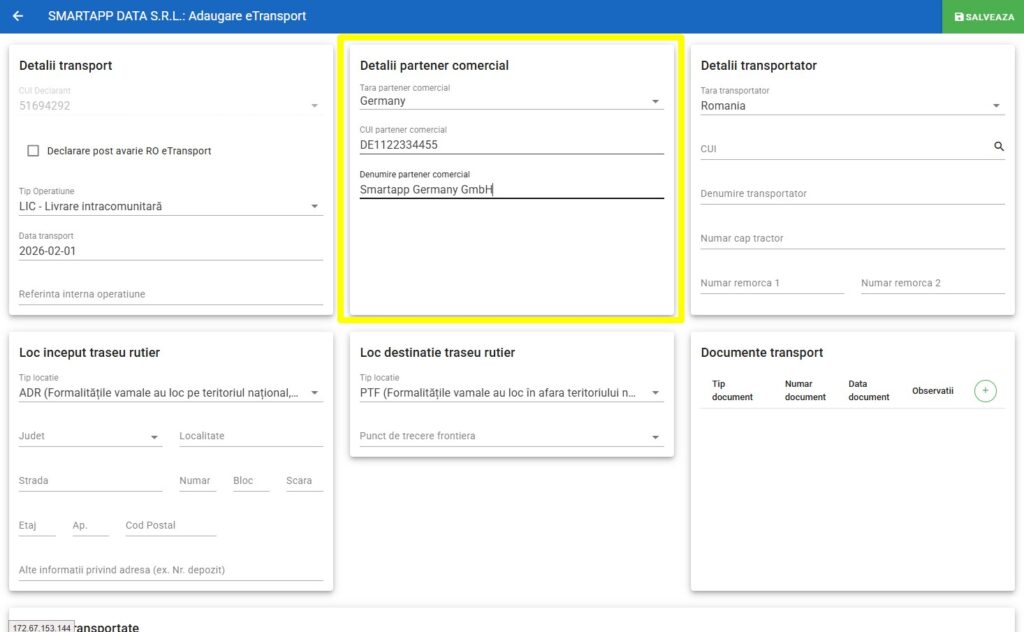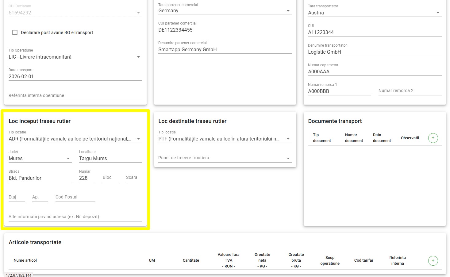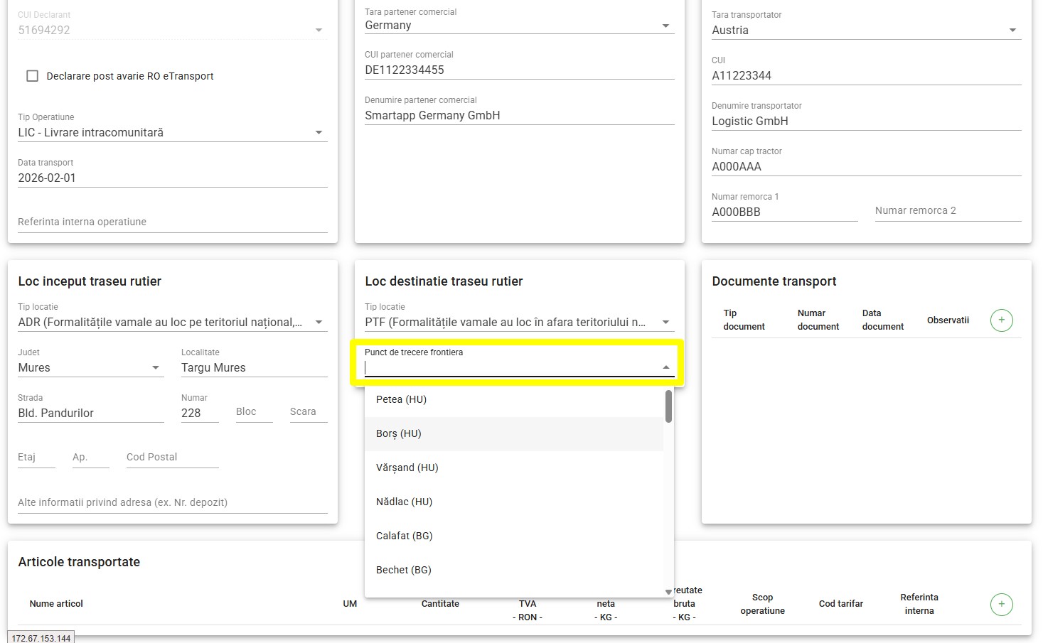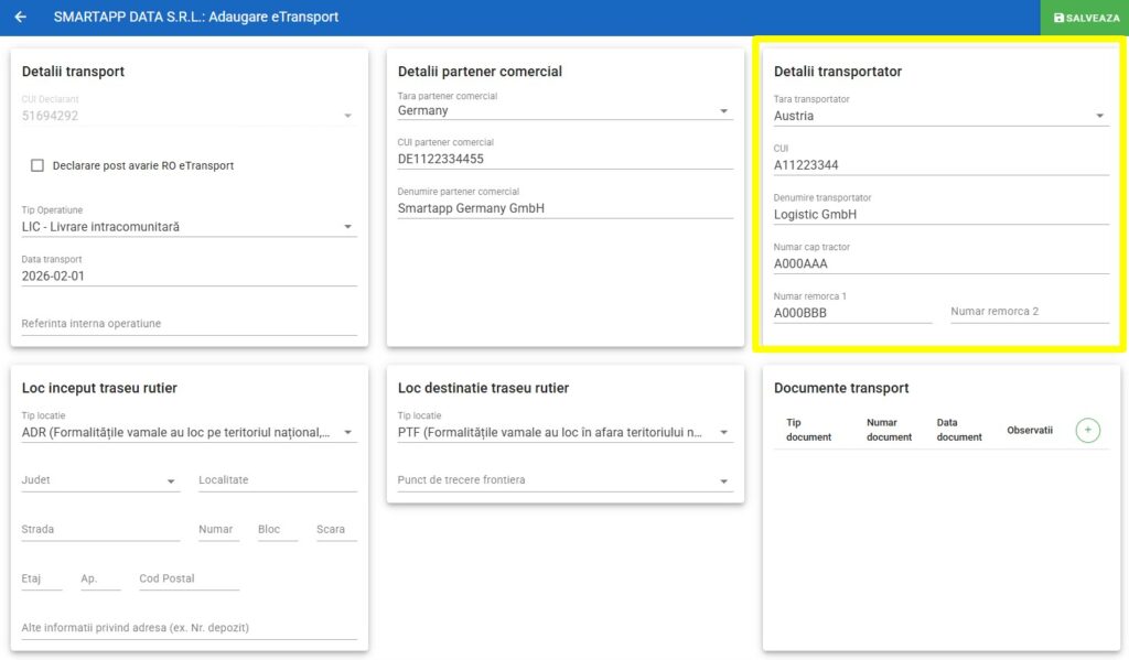 Transportator: Introduceți CUI-ul firmei de transport pentru interogare și validare automată.