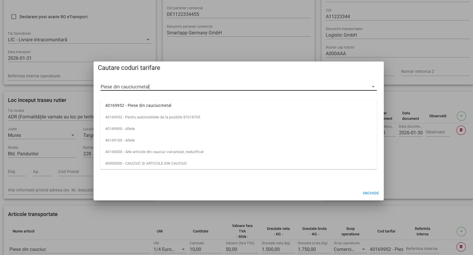Cod Tarifar: Introduceți primele cifre ale codului tarifar sau primele litere cu denumirea codului tarifar, iar sistemul va afișa sugestii prin autocompletare pentru a selecta codul corect.