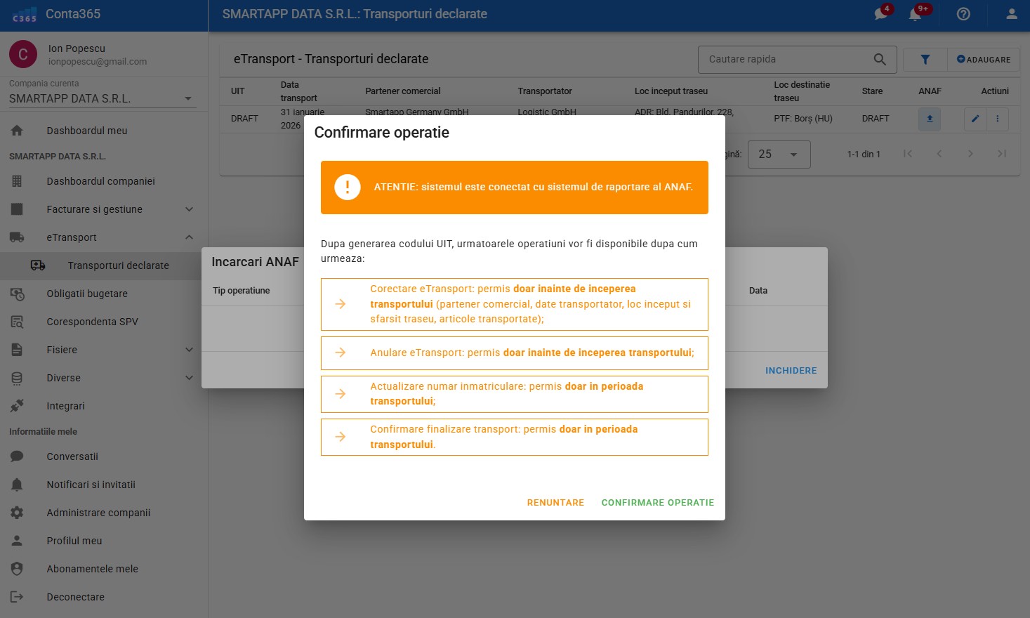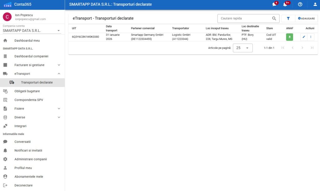 💡 Sfat: După ce ați verificat toate datele, nu uitați să apăsați butonul de Sincronizare ANAF. Doar după acest pas veți primi codul UIT care trebuie furnizat șoferului.