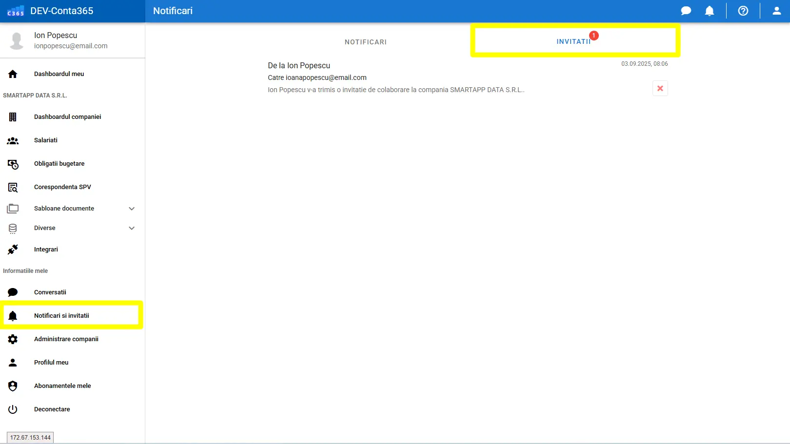 ✅ Gestionează invitațiile primite: Dacă alte firme te invită pe tine să le gestionezi datele, aici poți Accepta sau Respinge cererile lor.