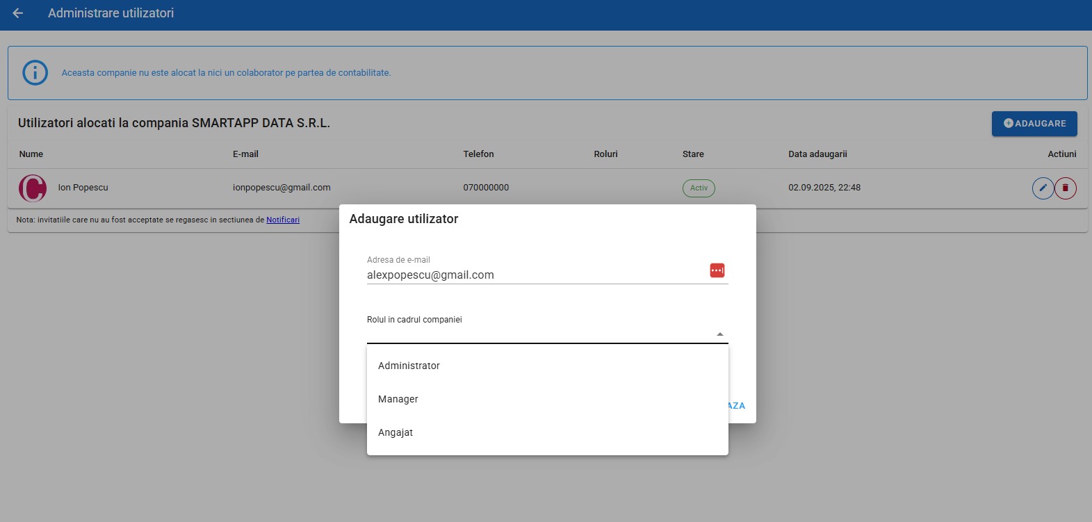 - Alege Rolul (Angajat, Manager sau Administrator) și apasă Salvează.